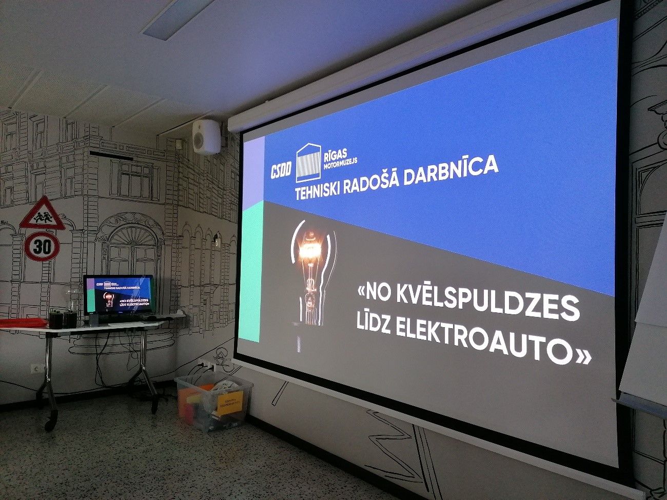 Otrajā pieturā – Rīgas Motormuzejā – izglītojamajiem bija iespēja ne vien zinoša gida pavadībā aplūkot muzeja vēsturiskos eksponātus, bet arī piedalīties tehniski radošā darbnīcā “No kvēlspuldzes līdz elektroauto”. Nodarbības teorētiskajā daļā izglītojamie uzklausīja stāstījumu par Tomasu Alvu Edisonu, viņa slavenākajiem izgudrojumiem un to, kā tie ietekmējuši pasaules industriālo attīstību, sākot no gaismas iedegšanas katrā mājā visā pasaulē līdz pat elektroautomobiļiem un to uzlādei Latvijā. Nodarbības praktiskajā daļā izglītojamie iejutās Edisona lomā un izveidoja elektrisko spuldzīti no dažādu materiālu kvēldiegiem, kā arī noskaidroja, kāpēc elektrību ražo arī citrons.